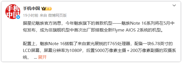4月27日,科技媒体“手机中国”在社交平台发帖称:“据星纪魅族官方消息,今年魅族旗下的首款机型——魅族Note 16系列将在5月中旬发布,成为非旗舰机型中首次出厂即搭载全新Flyme AlOS 2系统的机型。”